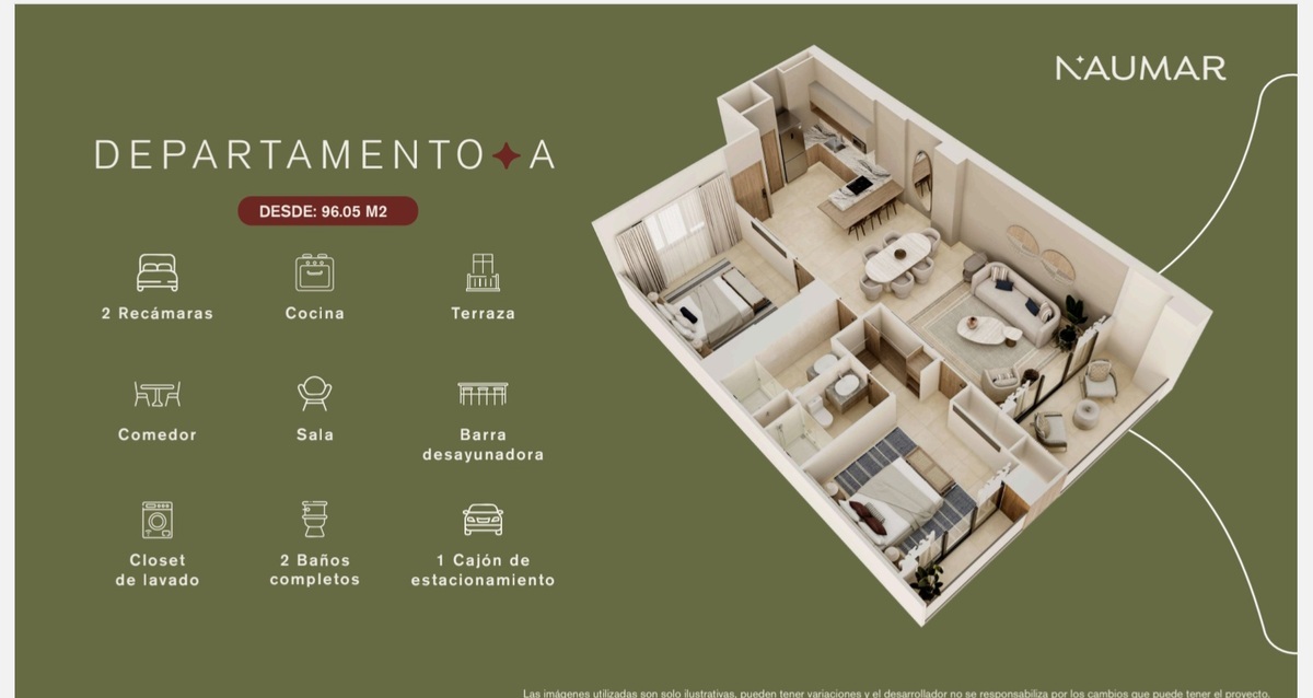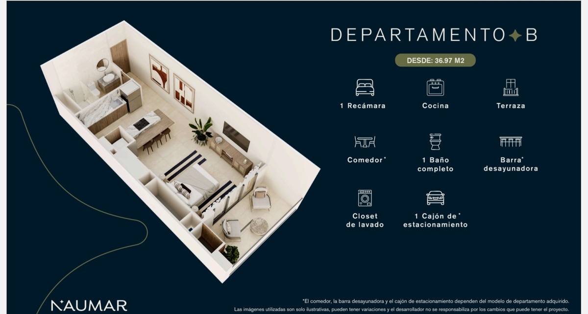 El desarrollo cuenta con una torre de departamentos de 1 o 2 recámaras, con construcciones desde 37.1m2 hasta 120.7 y precios desde $3,223,172 hasta $10,170,003