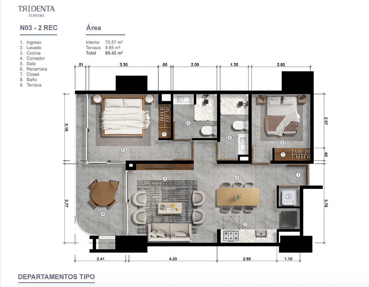 Diseñado por la prestigiosa firma GVA Arquitectos, Tridenta Towers presenta un estilo de vida de playa. Esta obra maestra arquitectónica ofrece 312 exquisitas residencias en la Torre 1 con vistas al mar y montaña, la más alta calidad de construcción, acabados de lujo y que ofrece espectaculares vistas de la bahía.