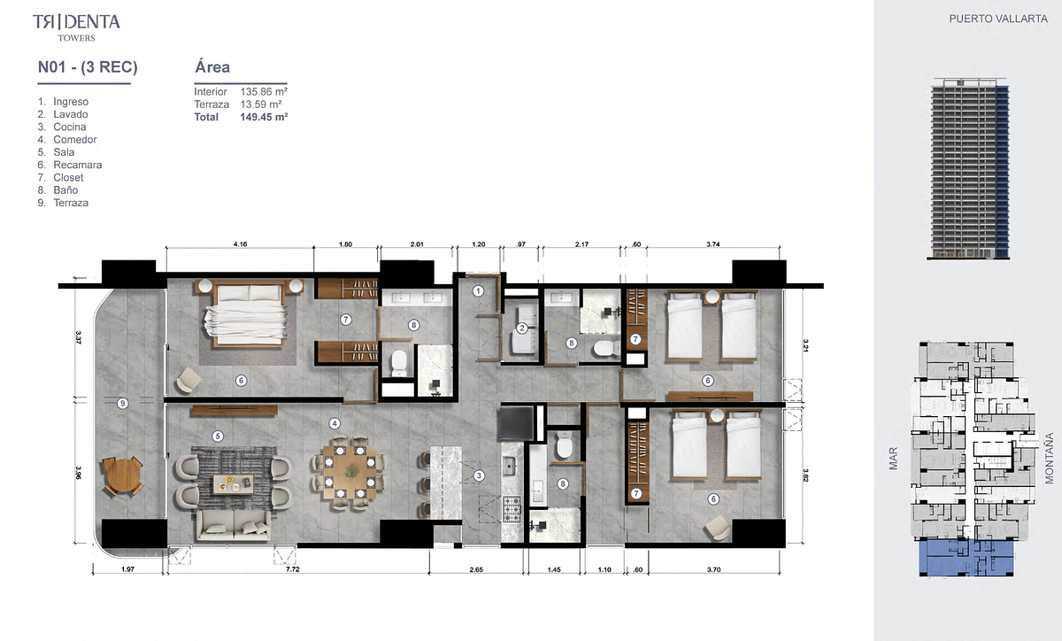 Diseñado por la prestigiosa firma GVA Arquitectos, Tridenta Towers presenta un estilo de vida de playa. Esta obra maestra arquitectónica ofrece 312 exquisitas residencias en la Torre 1 con vistas al mar y montaña, la más alta calidad de construcción, acabados de lujo y que ofrece espectaculares vistas de la bahía.