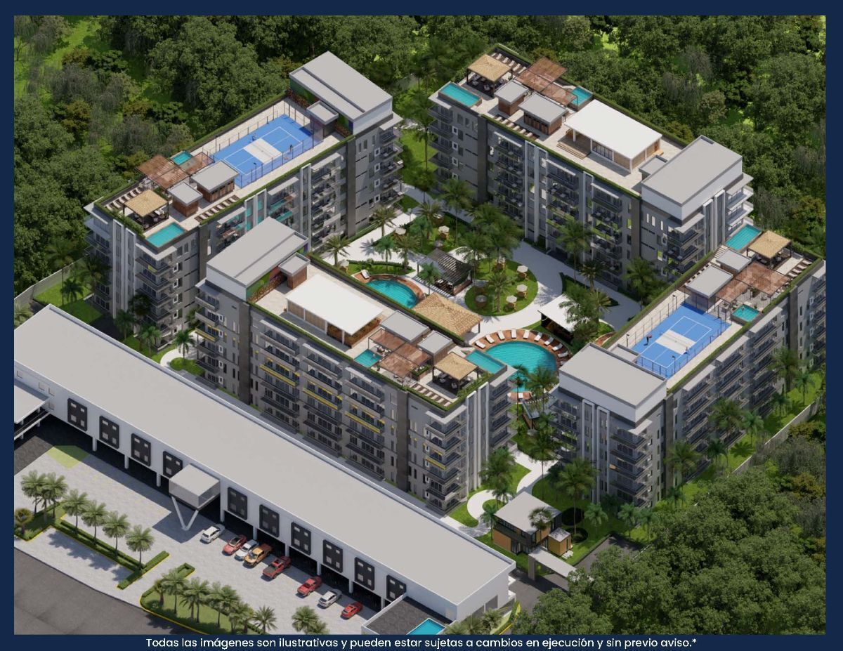 Condominio residencial de 4 torres de 6 niveles construidas con arquitectura contemporánea. Minimalismo, viviendas sostenibles, elegancia y sencillez en perfecta fusión con el entorno natural de este destino turístico de alto nivel.