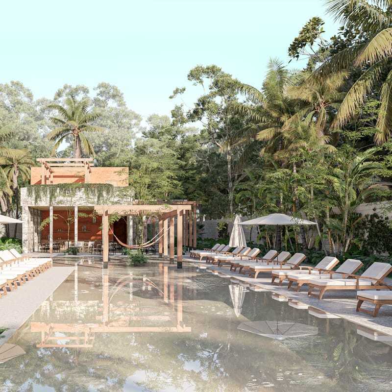 Un parque habitacional rodeado de vegetación y amenidades exclusivas del desarrollo.