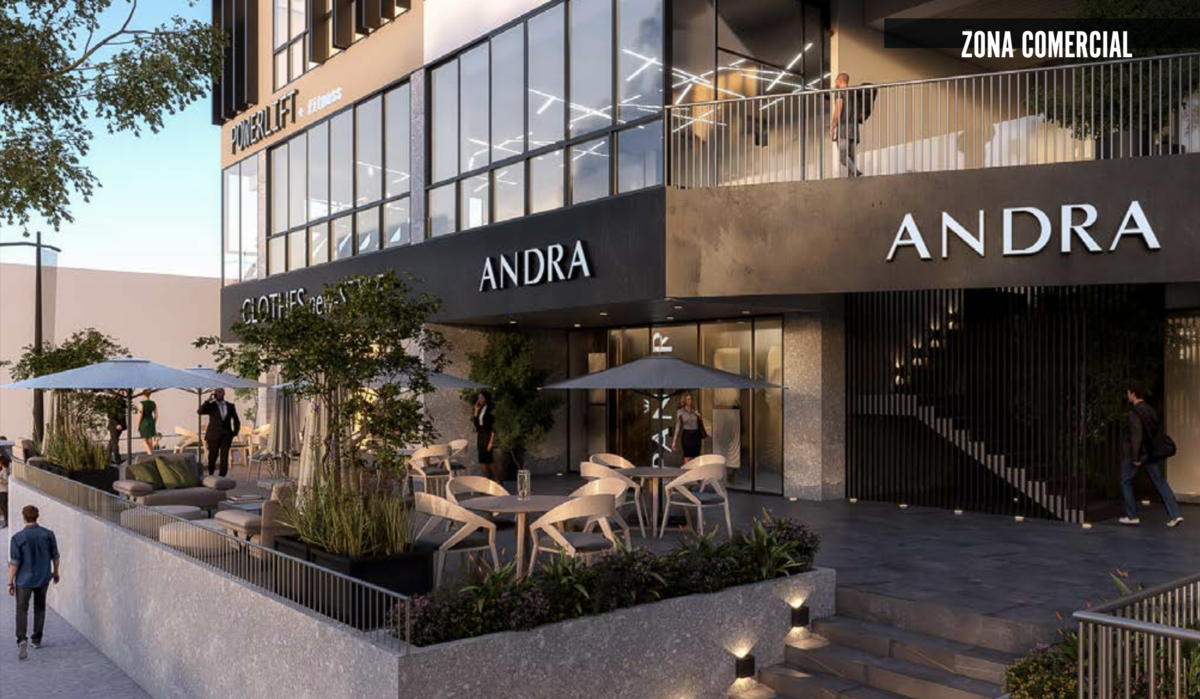 ZONA COMERCIAL · LOBBY · INGRESO EXCLUSIVO A VIVIENDAS · CORWORKING · FIRE PIT · SKY CINEMA · SKY YOGA · GYM · ROOF TOP BAR ·